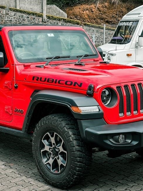 The 2021 Jeep Wrangler is renowned for its exceptional performance and off-road prowess․ Equipped with a powerful 3․6L V6 engine or an optional 2․0L turbocharged inline-4, it delivers robust power and torque․ The available eight-speed automatic or six-speed manual transmission enhances control in various driving conditions․ The Wrangler’s four-wheel-drive system, including the advanced Command-Trac part-time system, ensures superior traction on uneven terrains․ With high axle ratios (up to 4․10), it excels in rock crawling and towing․ The suspension system is tuned for optimal articulation, while the high ground clearance (up to 10․9 inches) and water fording capability (up to 30 inches) make it a formidable off-road vehicle․ Its approach (41․2 degrees) and departure angles (36․1 degrees) further enhance its capability in challenging environments․