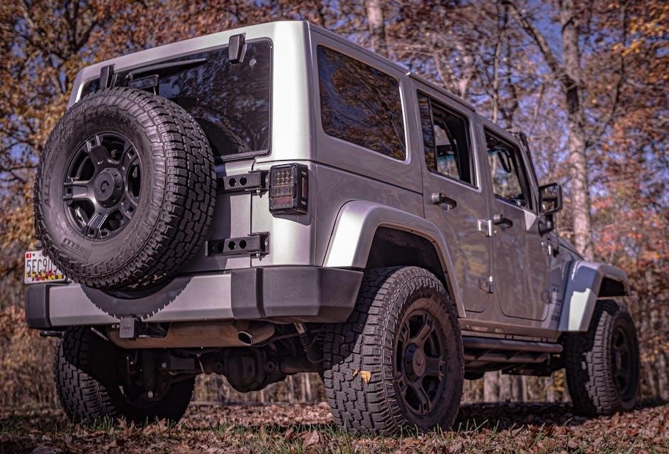 The 2021 Jeep Wrangler is equipped with a Tire Pressure Monitoring System (TPMS) that alerts you if tire pressure drops below the recommended level․ Always check tire pressure when the tires are cold, using the pressure gauge for accuracy․ The recommended pressure can be found on the tire information placard on the driver’s side doorjamb or in the manual․ Add air gradually, rechecking the pressure until it matches the specified level․ After adjusting, turn the ignition to the “ON” position to reset the TPMS․ Proper tire pressure improves fuel efficiency, handling, and safety․ Regular checks are essential, especially before long trips or off-road adventures․ Never ignore TPMS warnings, as underinflated tires can lead to reduced traction and increased risk of damage․ Always use a high-quality tire pressure gauge for accurate readings․